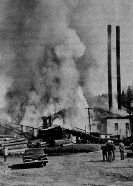 In March of 1967 this original band mill was completely destroyed by fire and was immediately replaced by a modern band mill, all-electric except for the steam shot-gun feed. This new mill started in operation January 1968 and because of its many modern and efficient features and machines, hardwood lumbermen from all over the East visited it continuously. The meat packinghouses always brag that they are able "to use all of the pig except the squeal." This was also true at the Bemis mill. Most all of the log is turned into lumber; the slabs and edgings were converted to chips which were shipped to the paper mill at Canton; and all of the bark and sawdust burned for steam for the sawmill and the dry kilns.