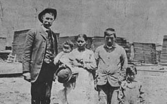 John Barker with Peter Conseen and family at the Snowbird mill of Kanawah Hardwood Company at the John Teesateska fields on Little Snowbird Creek, 1905 |