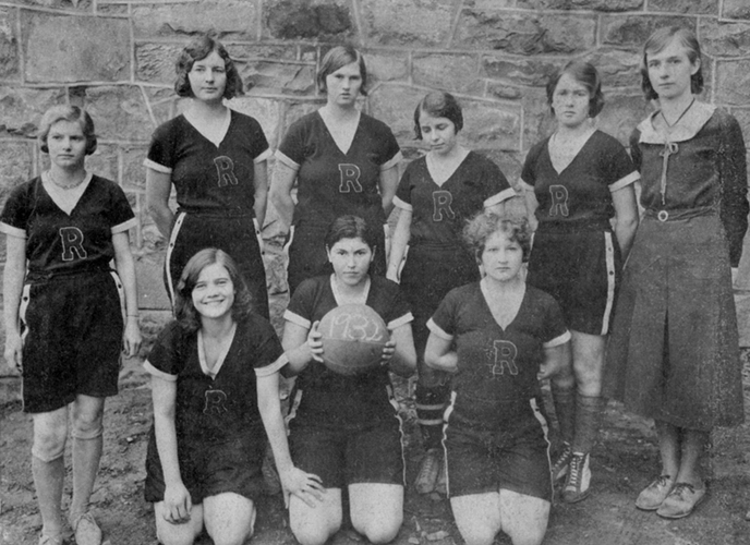 1932 R. H. S. girls championship basketball team (undefeated) - first champions of any sport. Front: Geneva Sawyer (Jordan), Lora Mae Moose (Garren), Edna Earl Postell (Somera) Back: Gorgia Rogers, Unknown, Helen Ghormley, Louise Carringer (Adams), Unknown, Edna Jones |